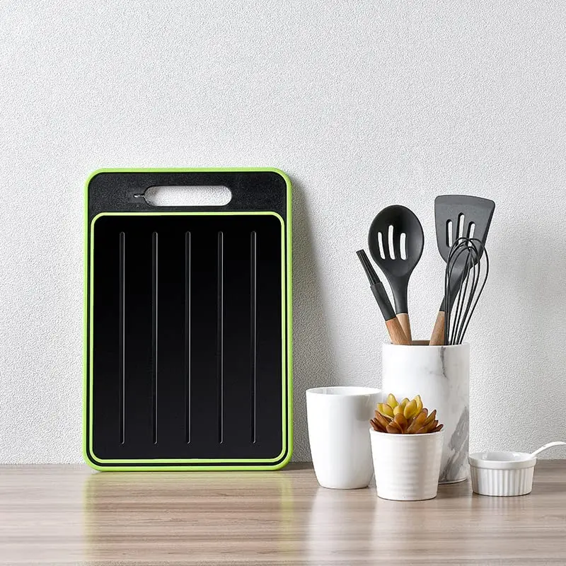 【EASY TO CLEAN】The material on both sides is not sticky, you can rinse with water to keep it clean. Please clean the cutting board in time after cutting meat or vegetables.maintain and heat resistant.Aluminum alloy stainless steel material can achieve rapid thawing of frozen food on one side.A cutting board aesthetically pleasing, functional, and lightweight. A slim design to fit anywhere in the drawers or cabinets. Make meal planning much easier.